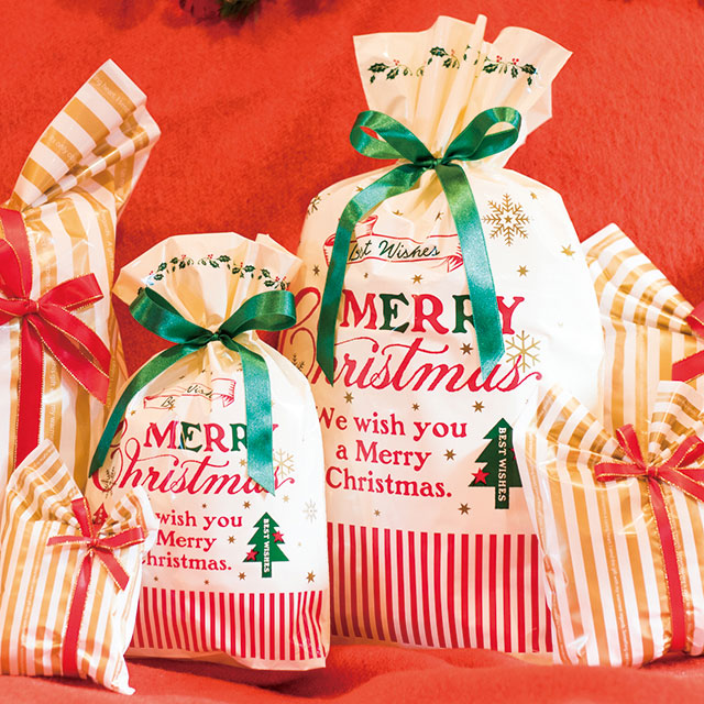 忙しいクリスマスにおすすめのリボン付ギフトバッグです。リボンを絞って結ぶだけで完成するカンタン・ベンリなアイテムです。カラフルでクラシカルなデザインは、お子様はもちろん幅広い年齢層へのギフトに対応できます。