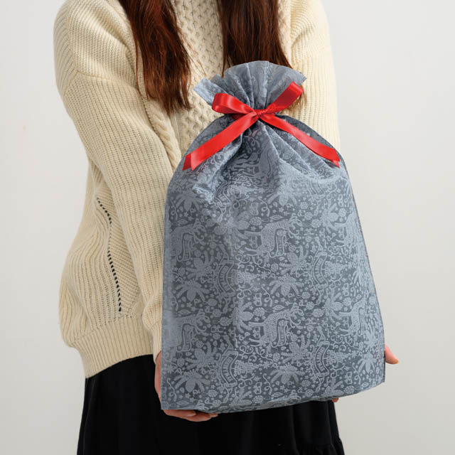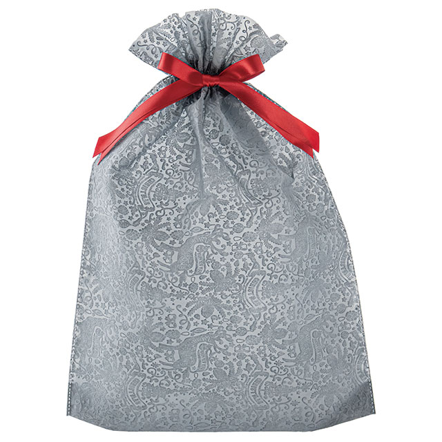 クリスマスデザインのリボン付不織布巾着バッグです。高級感のあるグレーの不織布にはエンボスデザインがさりげなく施され、ほのかな透け感も上品でワンランク上のギフトシーンを演出します。アクセントの赤のサテンリボンは、表裏を気にせず結べる両面サテン仕様。リボンを結ぶだけで簡単で華やかなギフト包装が完成し、忙しいクリスマスシーズンに大活躍します。
