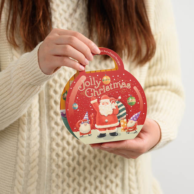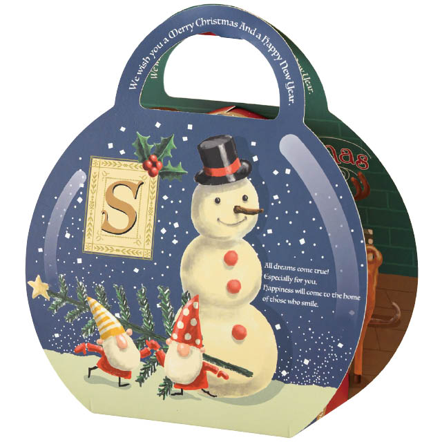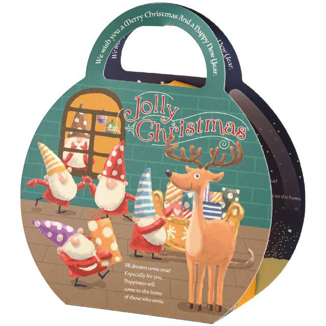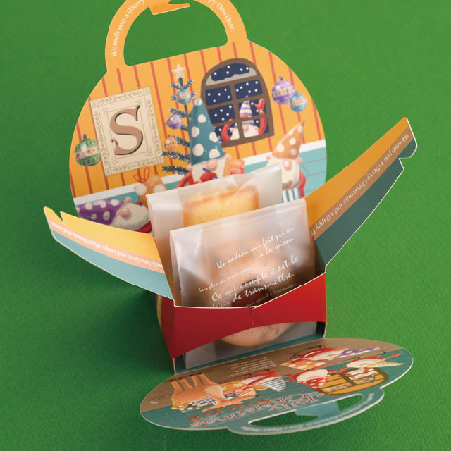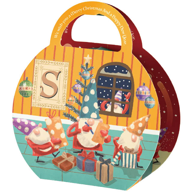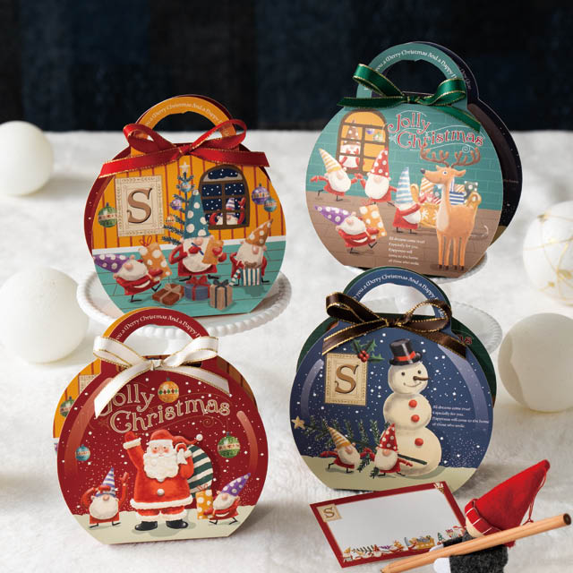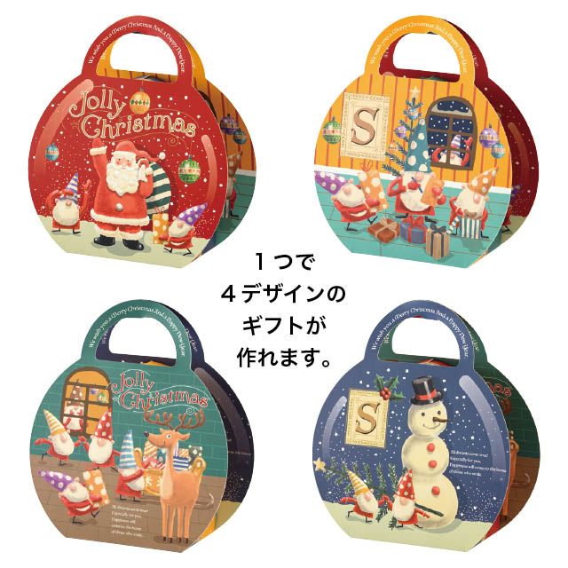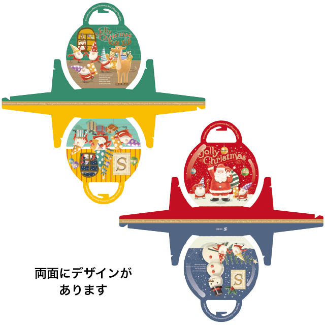 スノードームをイメージした、クリスマスデザインのハンドル付ギフトボックスです。コロンとした丸いフォルムに、サンタクロースとニッセたちのイラストをあしらった可愛いデザインで、クリスマスのにぎやかな雰囲気を演出。裏表、前後で、赤・黄・緑・青の4色のカラーと異なるイラストが入ったリバーシブルタイプで、向きや組み立て方を変えると異なる表情を楽しめ、ギフトやディスプレイに合わせて使い分けられます。ハンドル付きで手に取りやすく、クリスマスのお菓子やプレゼントを入れるのにぴったり。店頭のディスプレイとしても大活躍するギフトボックスです。