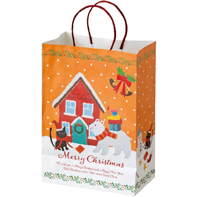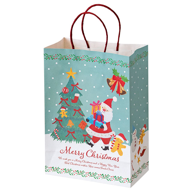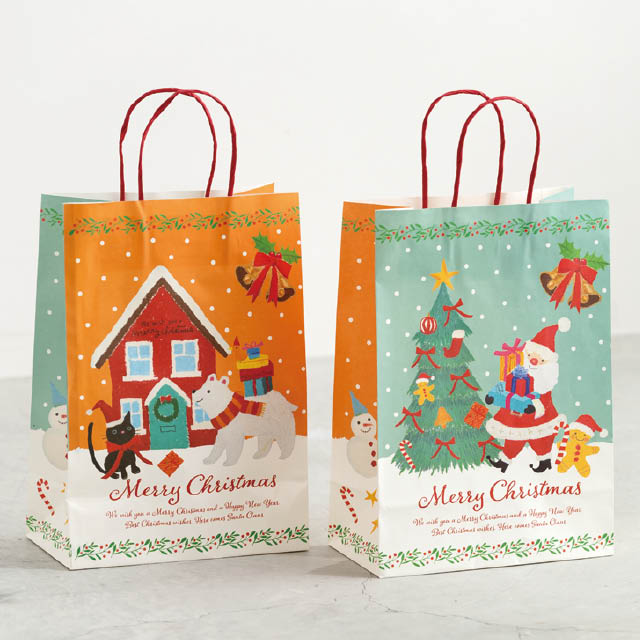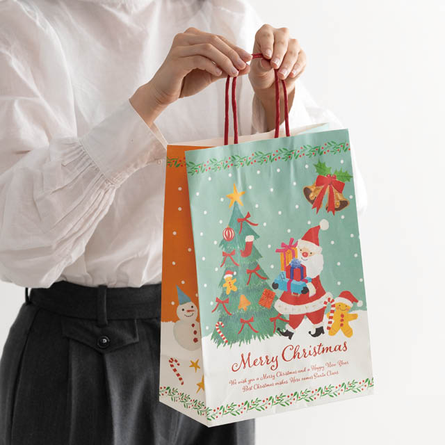 クリスマスキャラクターの紙袋です。やさしい顔のサンタクロースやツリーなど、オイルパステルの柔らかなタッチで描かれたイラストが魅力。裏表で異なるカラーとデザインがお楽しみいただけるので、どちらを見せても華やかで楽しい雰囲気に。お持ち帰り用の手提げ袋としてはもちろん、クリスマスギフトの詰め合わせラッピングや、お店のディスプレイにも最適。子どもから大人まで、老若男女問わずお使いいただけるデザインの紙袋です。季節感とやさしさが溢れるこの紙袋で、特別なクリスマスシーズンを彩ってみませんか?
