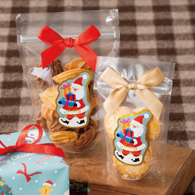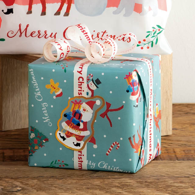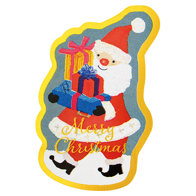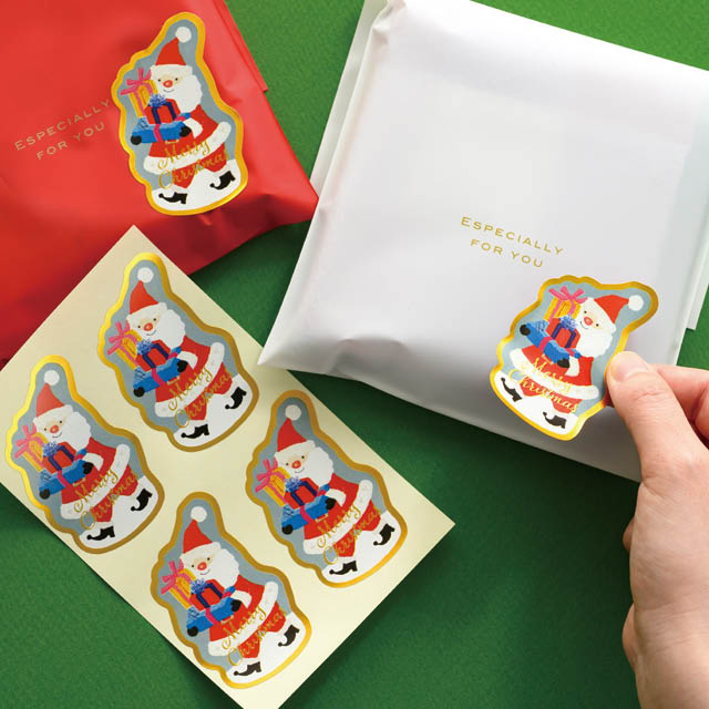 クリスマスのギフトシールです。プレゼントをたくさん持ったサンタクロースが、オイルパステルの柔らかなタッチで描かれた可愛らしいギフトシールです。このシールを貼るだけで簡単にクリスマスギフトが完成します。強粘着タイプのシールなので、梨地などのはがれやすい袋にもお使いいただけます。