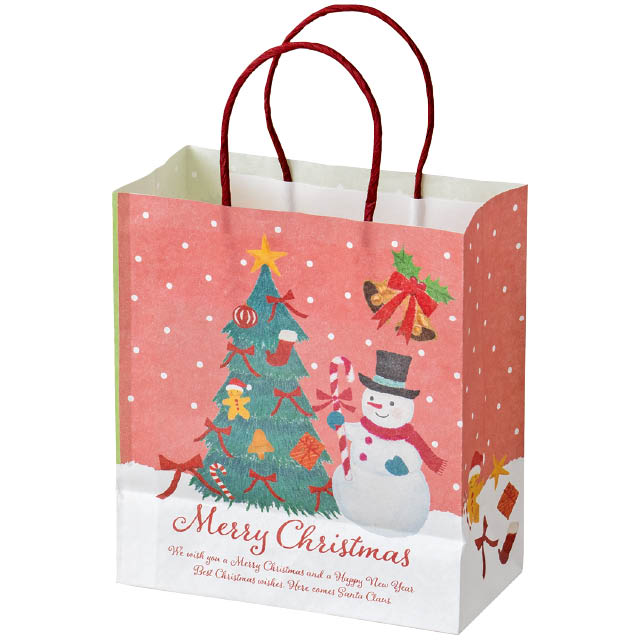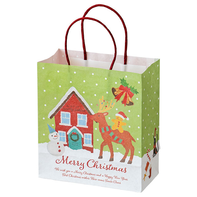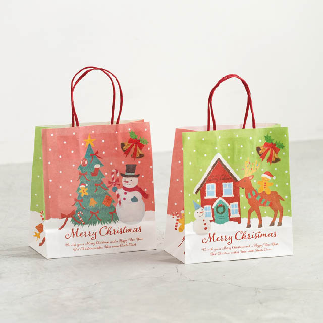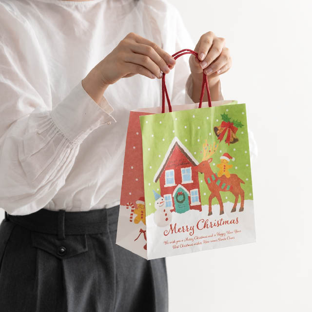 クリスマスキャラクターの紙袋です。やさしい顔のスノーマンやトナカイ、ツリーなど、オイルパステルの柔らかなタッチで描かれたイラストが魅力。裏表で異なるカラーとデザインがお楽しみいただけるので、どちらを見せても華やかで楽しい雰囲気に。お持ち帰り用の手提げ袋としてはもちろん、クリスマスギフトの詰め合わせラッピングや、お店のディスプレイにも最適。子どもから大人まで、老若男女問わずお使いいただけるデザインの紙袋です。季節感とやさしさが溢れるこの紙袋で、特別なクリスマスシーズンを彩ってみませんか?