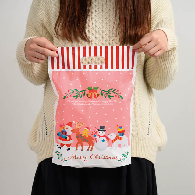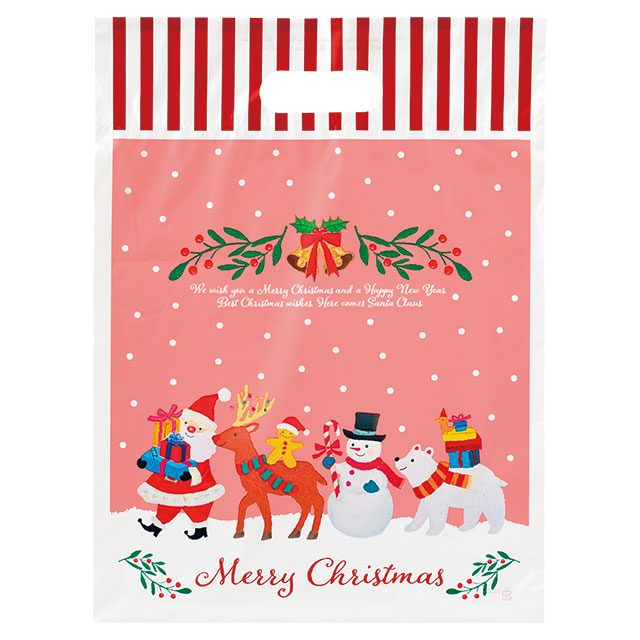 クリスマスキャラクターの手提げ袋(小判抜き)です。雪が舞うようなピンクの背景と、やさしい顔のサンタクロースやトナカイ、スノーマンなど、オイルパステルの柔らかなタッチで描かれたイラストが魅力。子どもから大人まで、老若男女問わずお使いいただけるデザインの手提げ袋です。サイズごとにカラーが異なるので、忙しいクリスマスシーズンの店頭でも一目でサイズが分かって管理しやすいのもポイントです。底マチ付きで厚みのある商品にも対応可能。アパレルや絵本などの持ち帰り袋におすすめです。