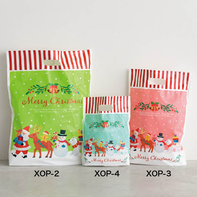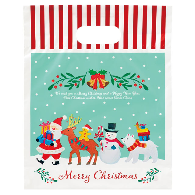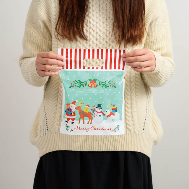 クリスマスキャラクターの手提げ袋(小判抜き)です。雪が舞うようなブルーの背景と、やさしい顔のサンタクロースやトナカイ、スノーマンなど、オイルパステルの柔らかなタッチで描かれたイラストが魅力。子どもから大人まで、老若男女問わずお使いいただけるデザインの手提げ袋です。サイズごとにカラーが異なるので、忙しいクリスマスシーズンの店頭でも一目でサイズが分かって管理しやすいのもポイントです。底マチ付きで厚みのある商品にも対応可能。アパレルや絵本などの持ち帰り袋におすすめです。
