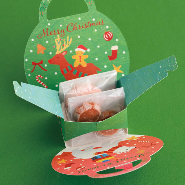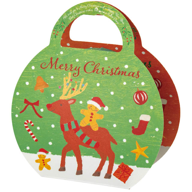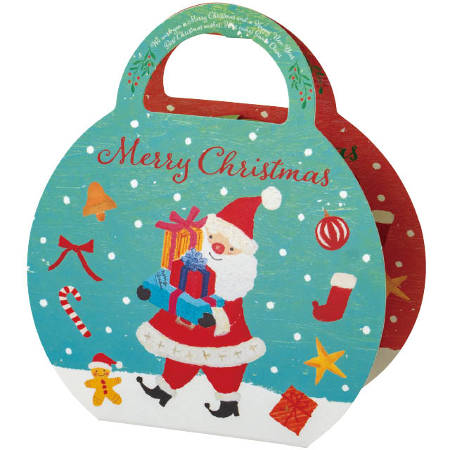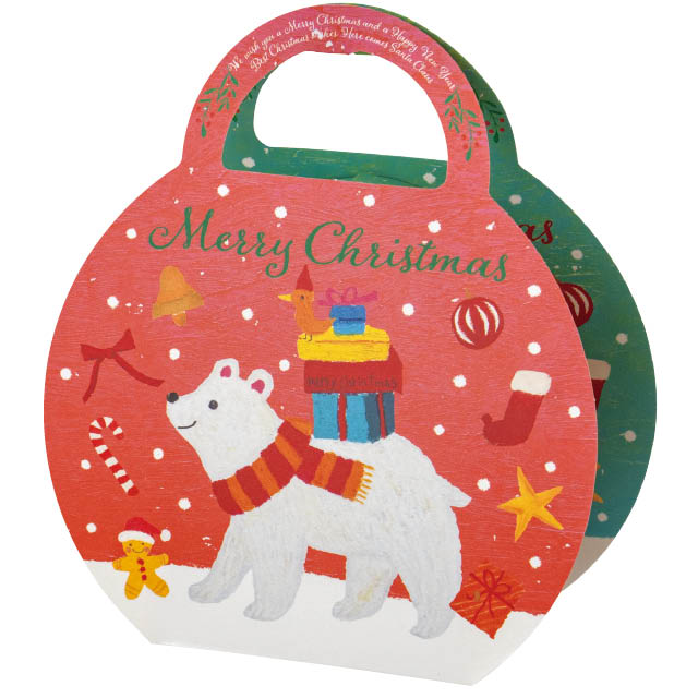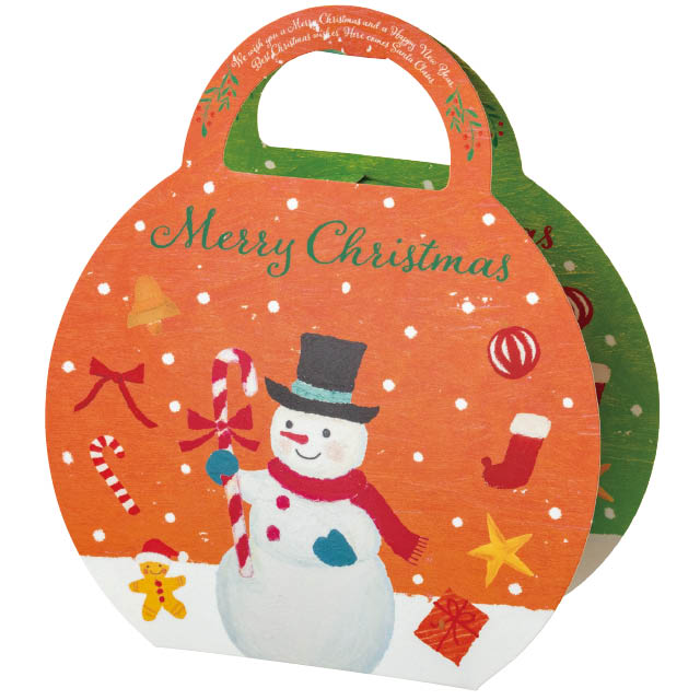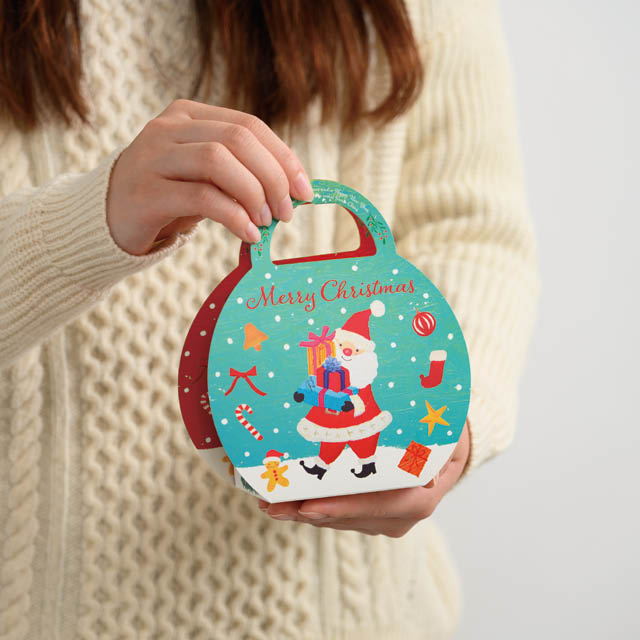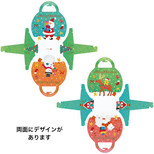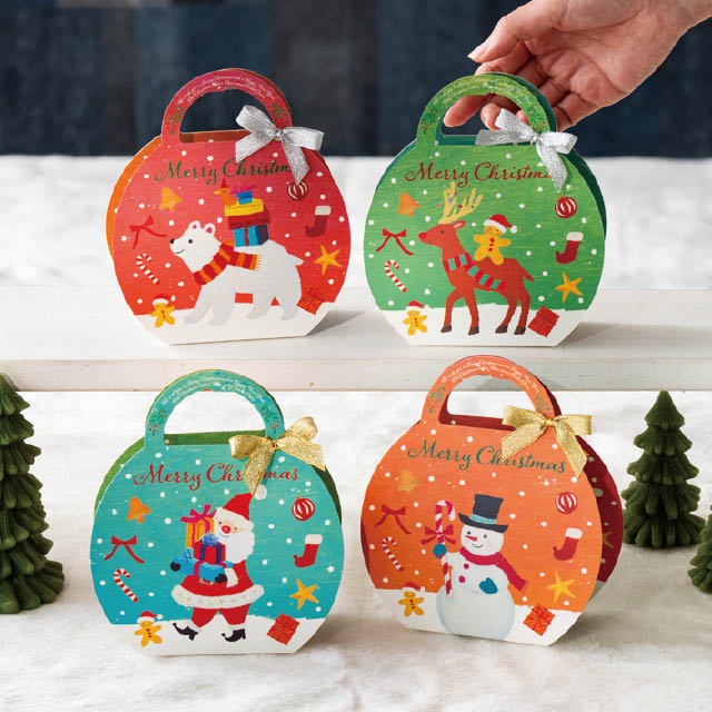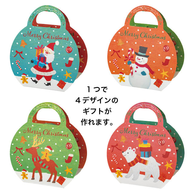 スノードームをイメージした、クリスマスデザインのハンドル付ギフトボックスです。コロンとした丸いフォルムに、オイルパステルで描いたサンタクロースやトナカイ、スノーマン、シロクマのイラストをあしらった可愛いデザインで、クリスマスの楽しい雰囲気を演出。裏表、前後で、ブルー、オレンジ、グリーン、ピンクの4色のカラーと異なるイラストが入ったリバーシブルタイプで、向きや組み立て方を変えると異なる表情を楽しめ、ギフトやディスプレイに合わせて使い分けられます。ハンドル付きで手に取りやすく、クリスマスのお菓子やプレゼントを入れるのにぴったり。店頭のディスプレイとしても大活躍するギフトボックスです。