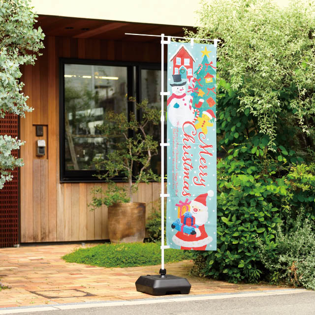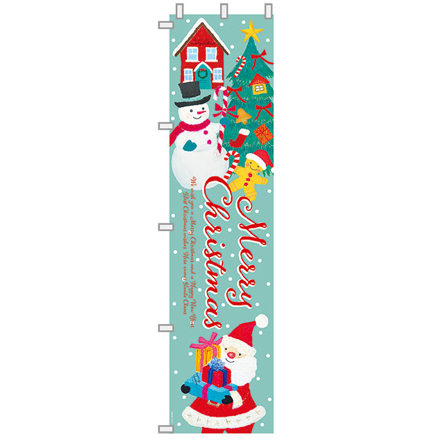 クリスマスキャラクターの店頭アピール用のぼりです。雪が舞うようなブルーの背景に、やさしい顔のサンタクロースやトナカイ、スノーマンなど、オイルパステルの柔らかなタッチで描かれたイラストが魅力。店頭のクリスマスムードを盛り上げてくれるのぼりです。
