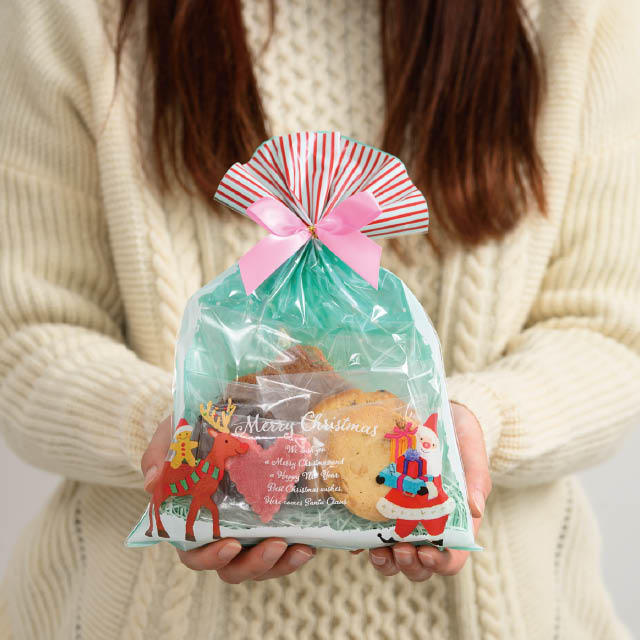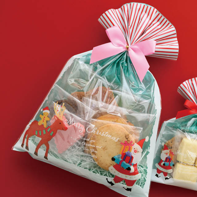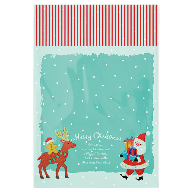 クリスマス用のOPP袋です。ブルーの雪空に、やさしい顔のサンタクロースとトナカイなど、オイルパステルの柔らかなタッチで描かれたクリスマスキャラクターのイラストが魅力。子どもから大人まで、老若男女問わずお使いいただけるデザインのOPP袋です。サイズごとにデザインが異なるので、忙しいクリスマスシーズンでも在庫管理しやすいのもポイントです。焼き菓子や雑貨のセットギフトにオススメのW200×H290mmサイズです。