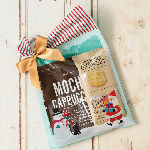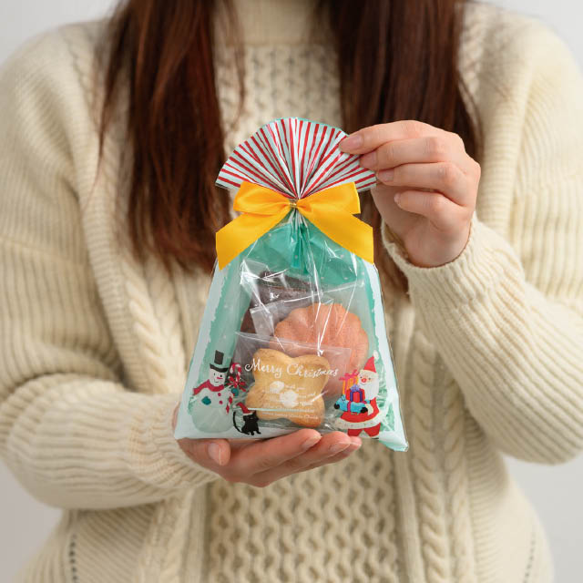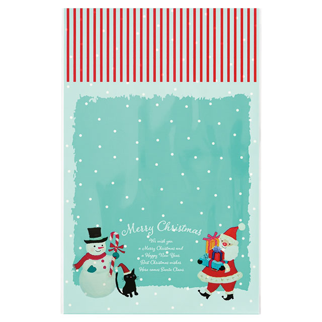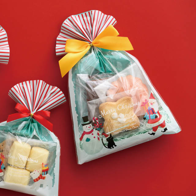 クリスマス用のOPP袋です。ブルーの雪空に、やさしい顔のサンタクロースとスノーマンなど、オイルパステルの柔らかなタッチで描かれたクリスマスキャラクターのイラストが魅力。子どもから大人まで、老若男女問わずお使いいただけるデザインのOPP袋です。サイズごとにデザインが異なるので、忙しいクリスマスシーズンでも在庫管理しやすいのもポイントです。焼き菓子や雑貨などのセットギフトにオススメのW150×H230mmサイズです。