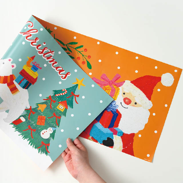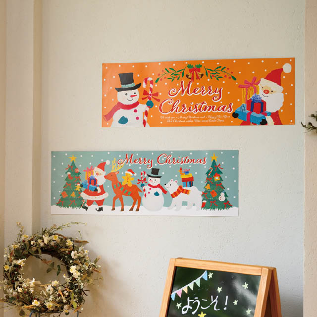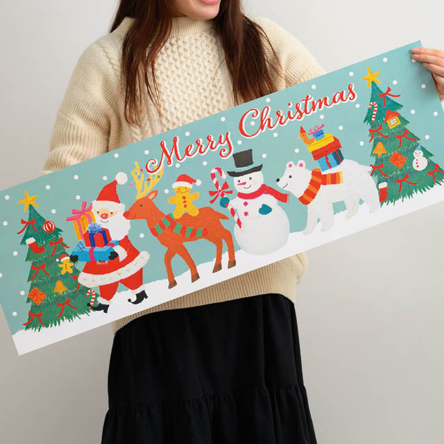 クリスマスの横長ポスターです。裏表でカラーとイラストが違うリバーシブルタイプなので、店頭のウィンドウディスプレイに最適です。やさしい顔のサンタクロースやトナカイ、スノーマンなど、オイルパステルの柔らかなタッチで描かれたイラストがクリスマスムードを盛り上げてくれます。