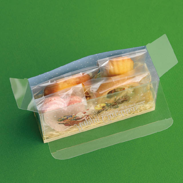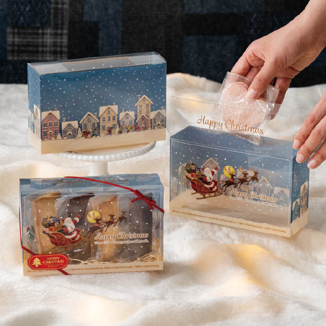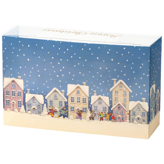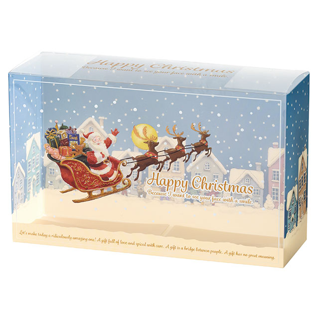 サンタと雪景色が素敵なクリスマスPETボックスです。トナカイの引くソリに乗って世界中にプレゼントを届けるサンタクロースを、柔らかく温かみのあるタッチ描かれたイラストが魅力。PET素材の透明感を活かしたデザインで、お菓子を取り出すと、雪遊びをしながらサンタクロースの訪れを楽しみに待つ人々と雪景色の街並みがうっすらと浮かび上がる、こだわりのアートワークもポイントです。