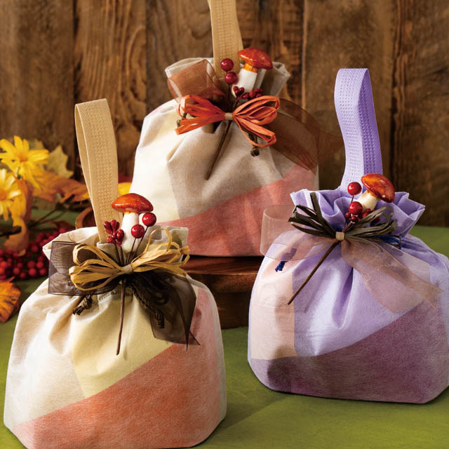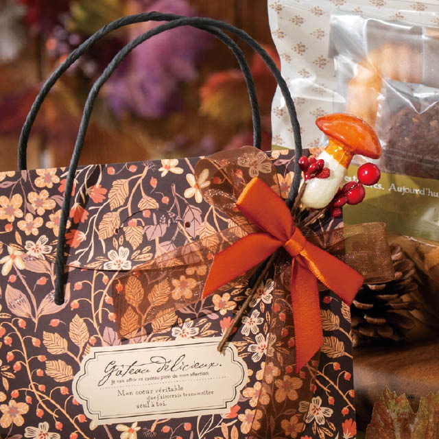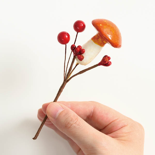 大小の赤い実とオレンジ色のきのこがついた秋の造花です。夏の終わりから冬の始まりまで、長くご利用いただけます。ハロウィンのラッピングにもおすすめの造花です。