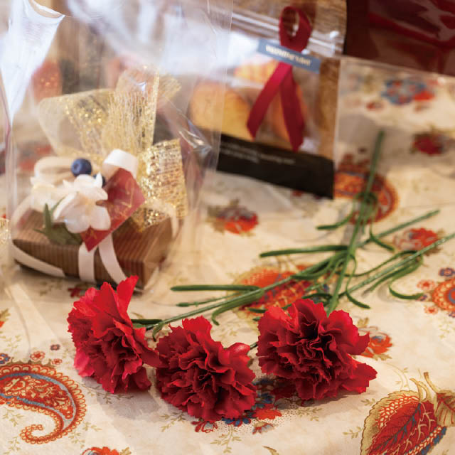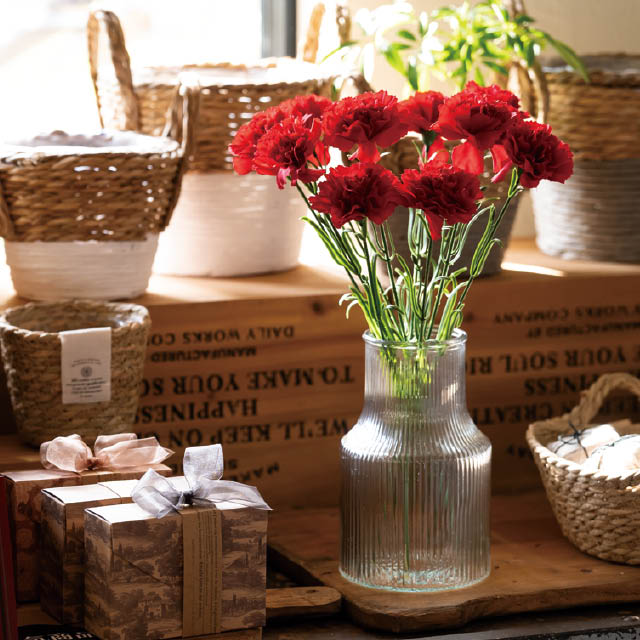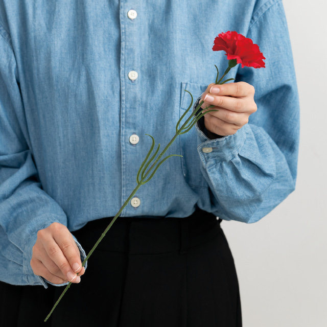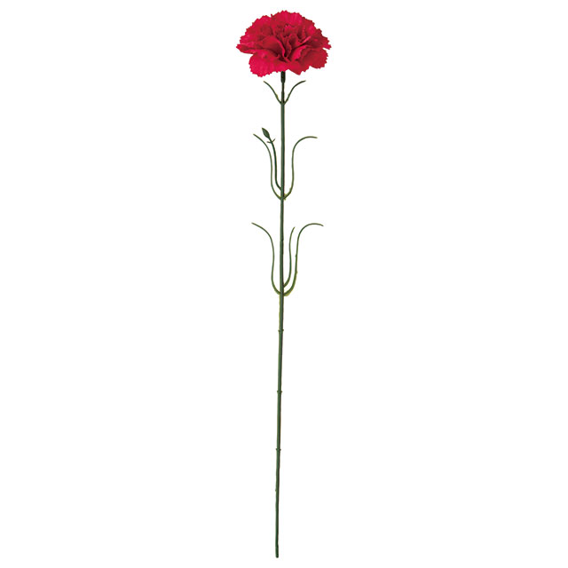 母の日の赤いカーネーション造花です。花径約80mmの大輪サイズの造花で、そのまま飾るのはもちろん、花器に挿したり、数本組み合わせてブーケ風にアレンジするのもおすすめです。定番の鮮やかな赤のカーネーションは、レジ横やカウンター周り、棚飾りなど、母の日のディスプレイに欠かせないアイテムです。
