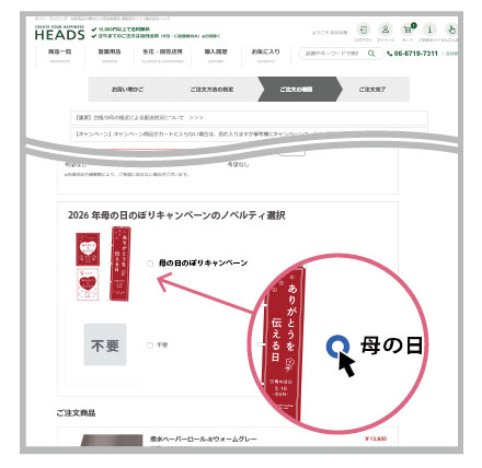 「ノベルティ選択」欄より、「母の日のぼりキャンペーン」をご選択ください。