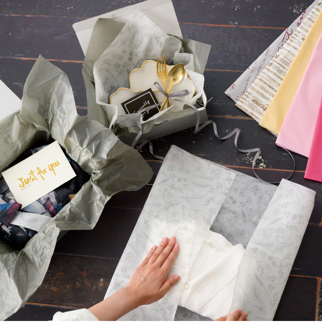 ▼お客様のお声 ●カラーのものや、デザイン付きのものを利用して商品をあけたときの演出にお客様から喜ばれています。(徳島県/アパレルショップ様) ●詰め物に使ったり、商品を包んだり、色々な用途で使えて、使い勝手が良いです。(福井県/雑貨店様) |