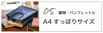 マチが広いのでモノの出し入れがしやすく、お弁当やケーキのサービス箱、生花などもキレイに入ります。多少の水滴にも強い素材なので安心です。
