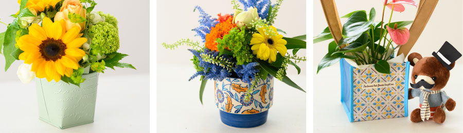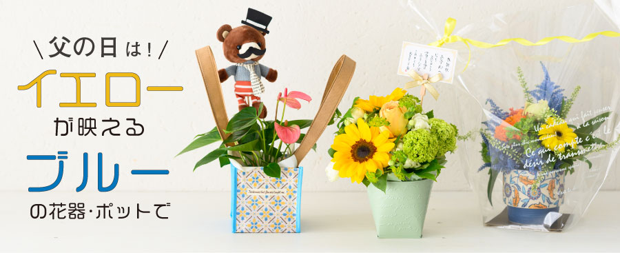 父の日は!イエローが映えるブルーの花器・ポットで!