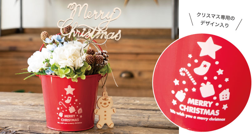 クリスマスにぴったりな真っ赤なブリキバケツ。付属のジンジャーマンの木製タッグも、クリスマス感をたっぷり演出!シートを引いてアレンジや、3.5号の植物を合わせてご利用いただけます。