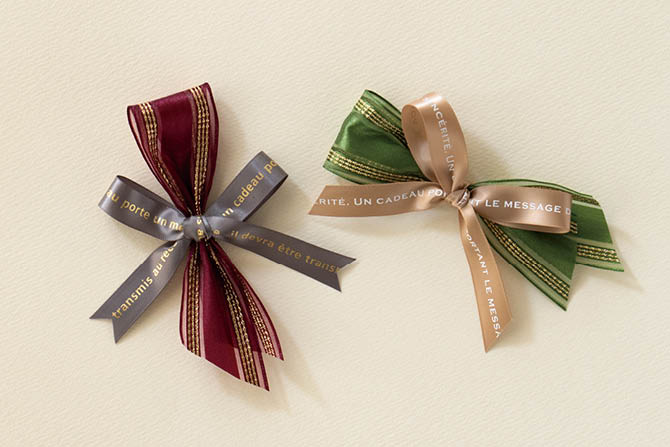 ゴールドのラインが入った幅太のリボンはハリ感のある素材で扱いやすく、落ち着きのある色味なので洋風と和風どちらにも合わせてお使いいただけます。