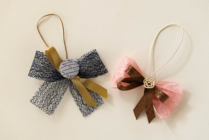 右の梅の水引が付いたゴムリボンも、進物箱などに合わせるアイテムですが、使い方次第でアレンジリボンのアクセントに。