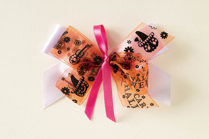 メキシコの死者の日からイメージした、賑やかなハロウィンデザインのオーガンジーリボンをファンシーカラーと組み合わせた可愛らしいアレンジです。