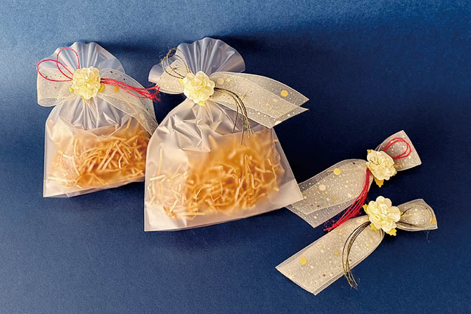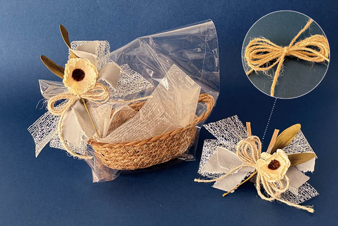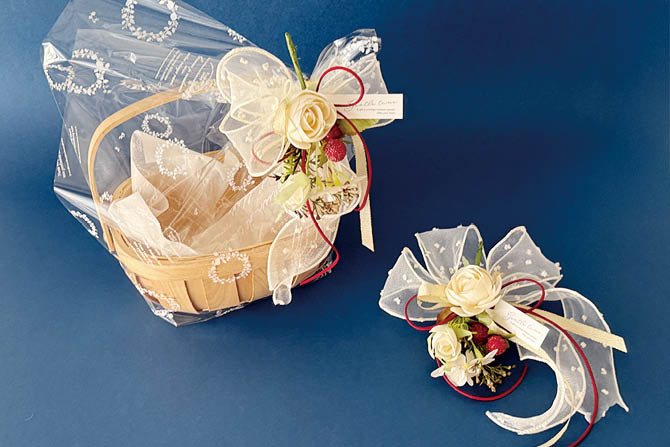 ふんわりしたシフォンリボンにバラの造花をあわせ、細めのゴールドリボンできらめきを、素材感のあるスエードリボンで温かみをプラス。 シンプルなタグを添えた作り置きリボンは、大きめのカゴ盛りラッピングにおすすめ。