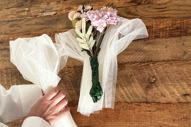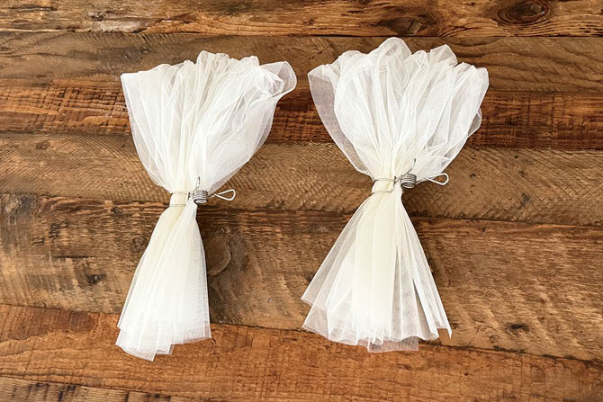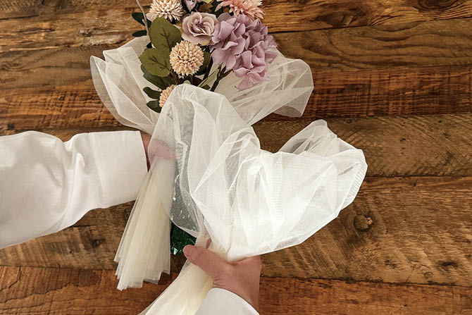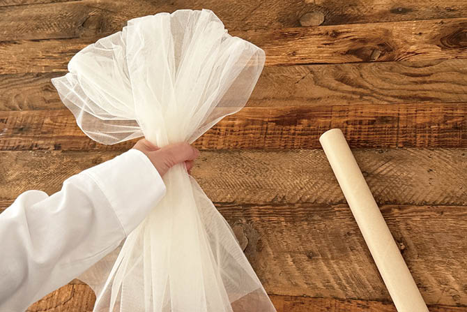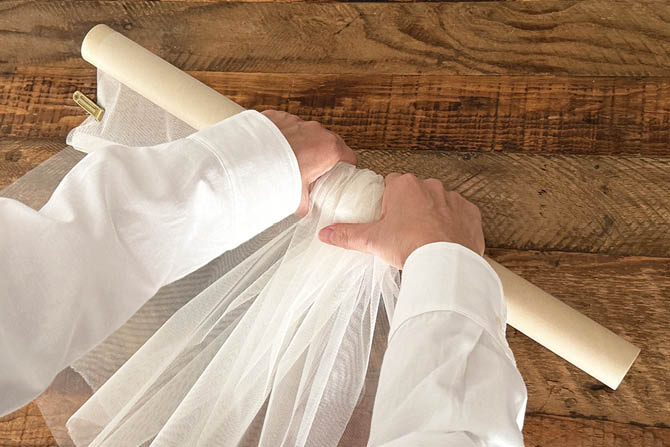 ロールの芯にチュールをかけ、端からくしゅくしゅと寄せていきます。