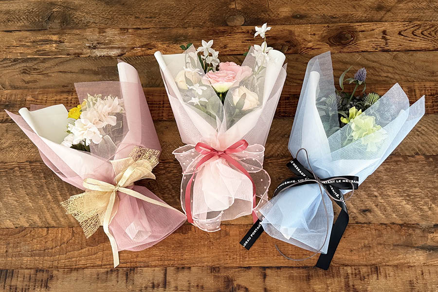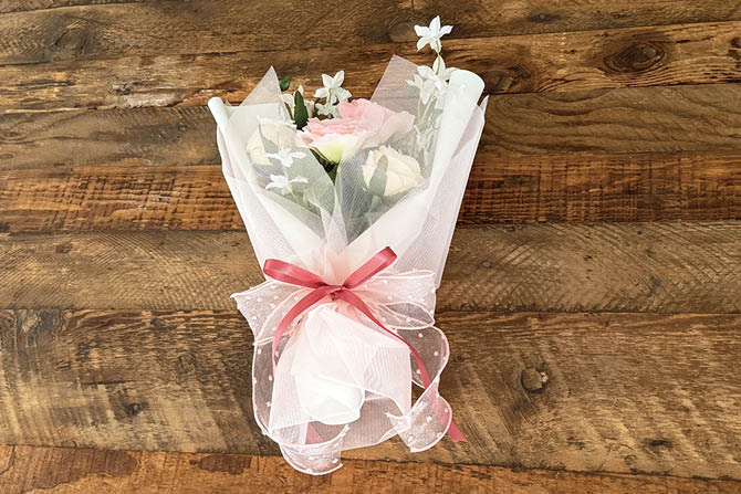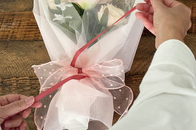 細リボンをブーケの後ろ側で交差させてから前にまわし、太リボンの上下から出して蝶結びをします。