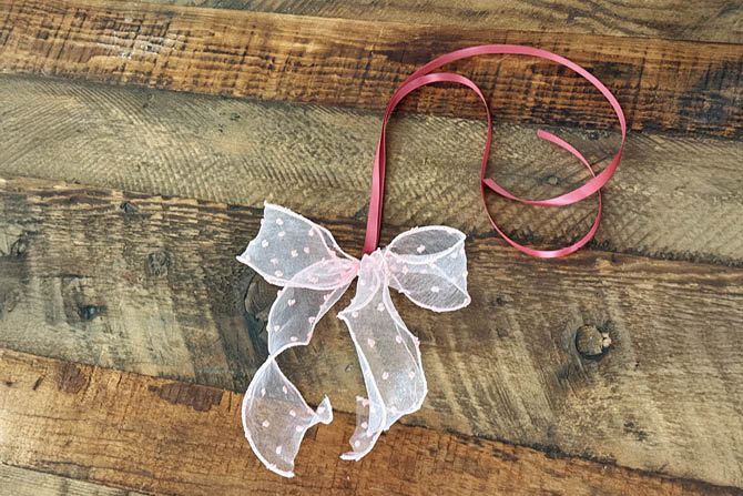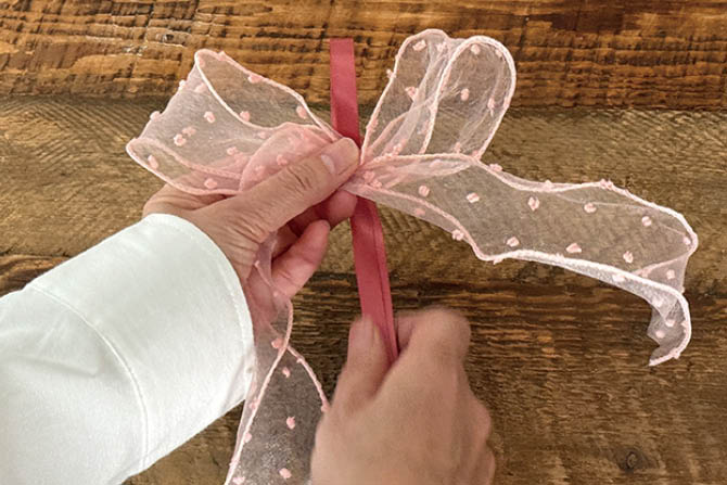 細リボンの端を上の輪の部分に通してぎゅっと締めます。