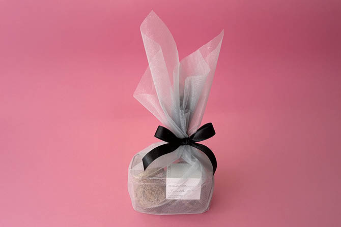 くすみカラーと上品な透け感がおしゃれなチュールファブリックロールで、プラケースを包むラッピングアイデア。