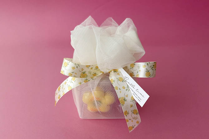 50cm角にカットしたチュールをプラケースの天面に寄せて輪ゴムで留め、チュールの四隅を中に押し込んでふんわりとさせたお花のようなラッピングです。
