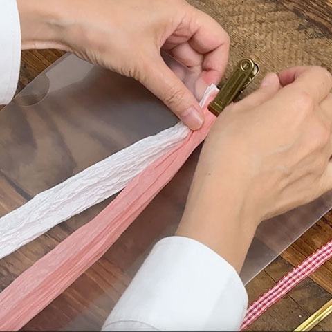 [1]ツインリボンをリボンの形に整え、クリップで仮留めします。