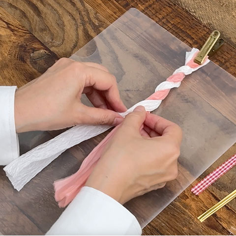 [1]2本のペーパーラフィアリボンを、手でにぎって細くします。