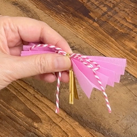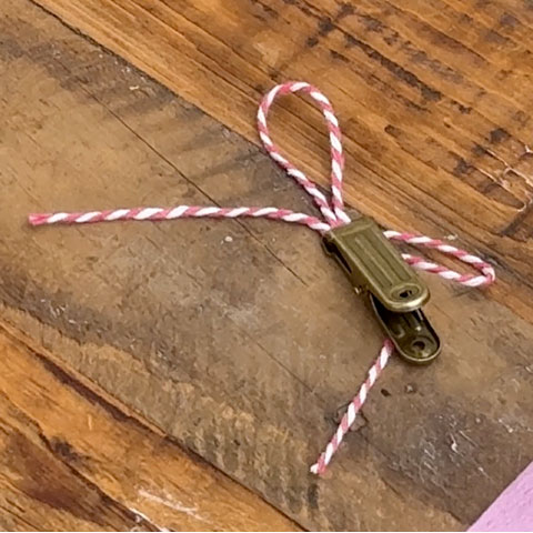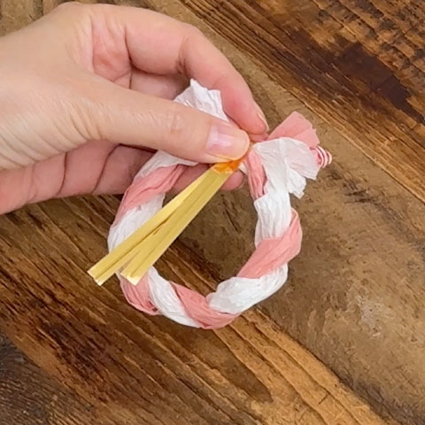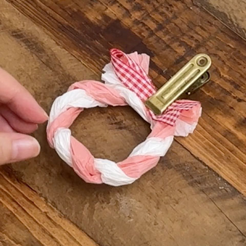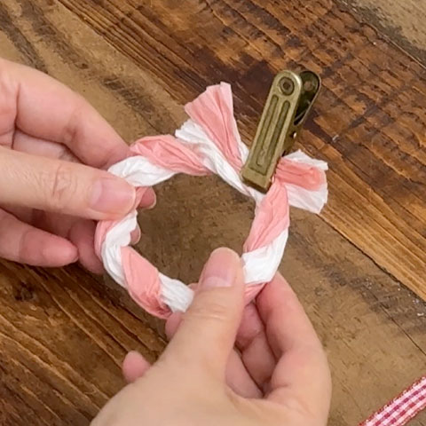 [4]ねじった[3]を輪にし、端同士を交差させてクリップで仮留めします。