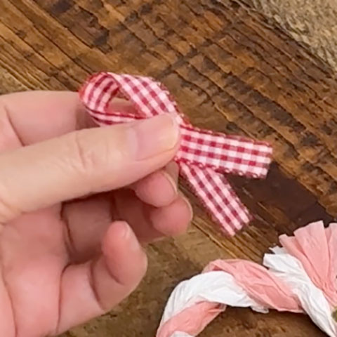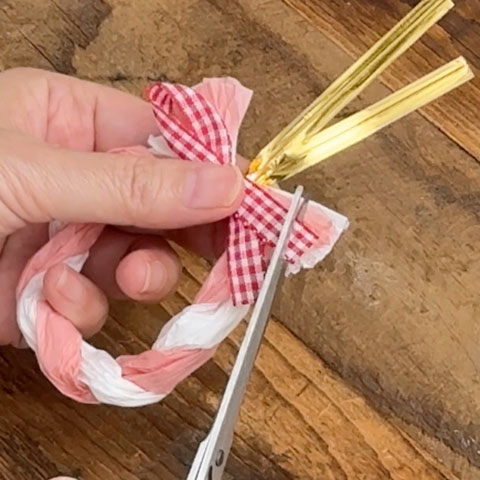 [8]チェックリボンの端をカットし、形を整えてワイヤータイの出来上がりです。