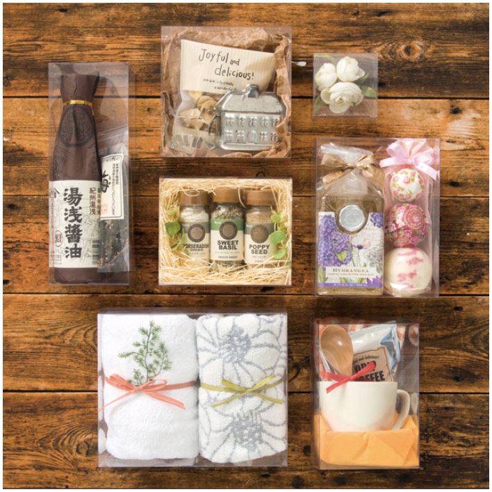 中身が見えるセットギフトにぴったりのハンドル付バッグ。気取らないカジュアルなセットギフトにおすすめです。中身が見えるのでカラフルな瓶やボトルにおすすめ。ハンドル部分にリボンや造花など、季節やイベント感を感じさせる小物をあしらうと可愛く仕上がります。