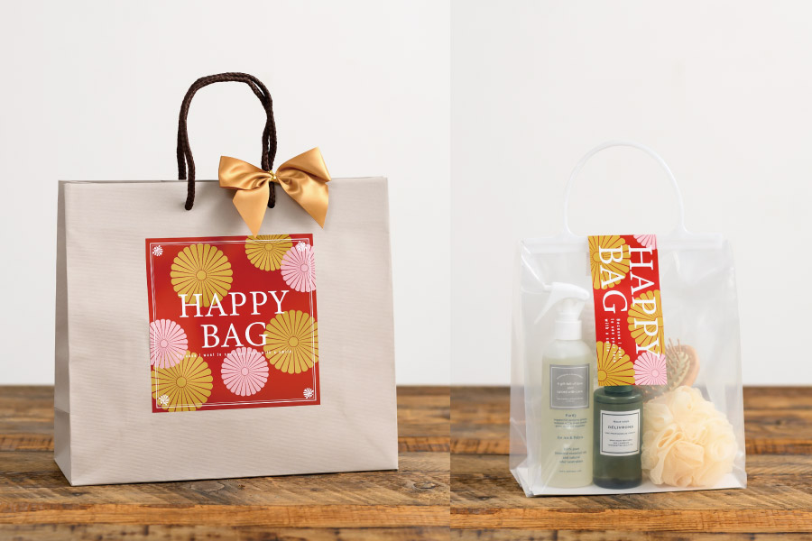 「HAPPY BAG」シールは、無地のバッグや箱に貼るだけで、あっという間に福袋が完成します。