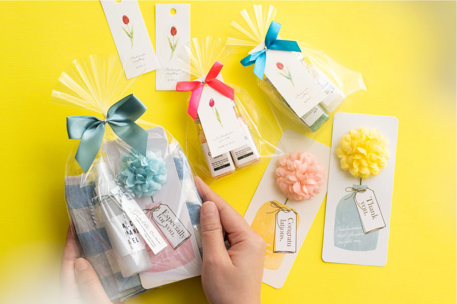 いつものギフトに造花付きのカードや、チューリップなどのデザインのタグを添えるだけで、春らしいギフトに早変わり!