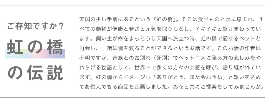 「虹の橋」は株式会社インラビングメモリーの登録商標です。商標の無断使用は権利侵害に当たりますので、使用許可なく商品名としてはご使用になれません。