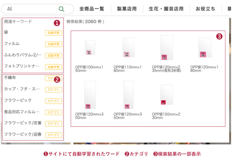 ワードを打ち込むとその言葉に対応したおすすめ候補が表示されます。多く検索されているワードや近しいワードを持つカテゴリが表示されます。こちらの機能もまた、パソコン使用時、カーソルを合わせた際に検索結果の一部が表示されます。