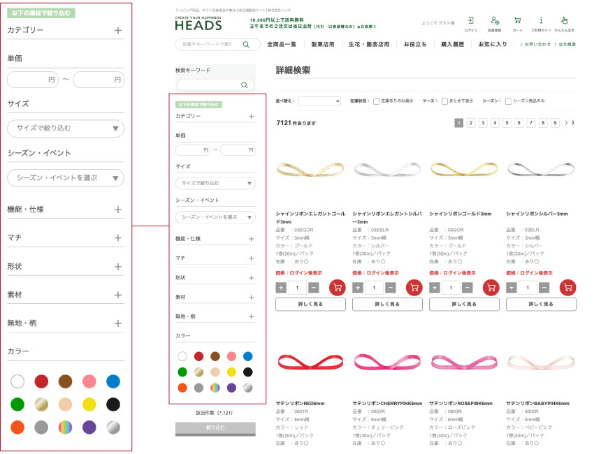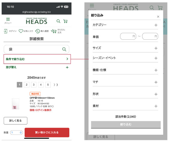 検索後に絞り込みの項目がパソコン及びタブレットにおいて左サイドに、スマートフォンの場合には検索窓の下に「条件を絞り込む」として表示されます。絞り込む項目は「カテゴリー」「単価」「サイズ」「シーズン・イベント」「機能・仕様」「マチの有無」「形状」「素材」「無地か柄」「色」がご利用いただけます。(検索した商品に該当項目が含まれる場合にのみ表示されます)