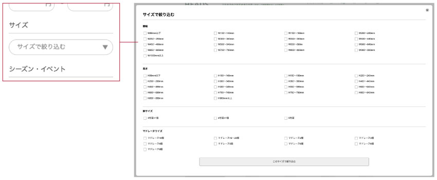 PCおよびタブレットにおいてサイズで絞り込むをクリックした際には、別ウィンドウにて項目を選択いただけます。