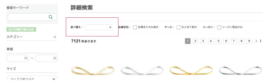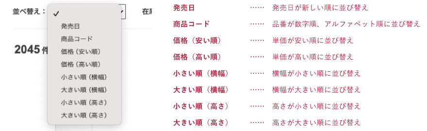 検索後、該当商品を「発売日」「商品コード」「価格」「横幅」「高さ」で並び替えることができます。