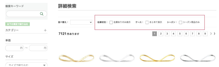 また、チェックボックスを選択すると「在庫がある」、「まとめ割がある」、「シーズンの登録がある」のみを表示させることができます。