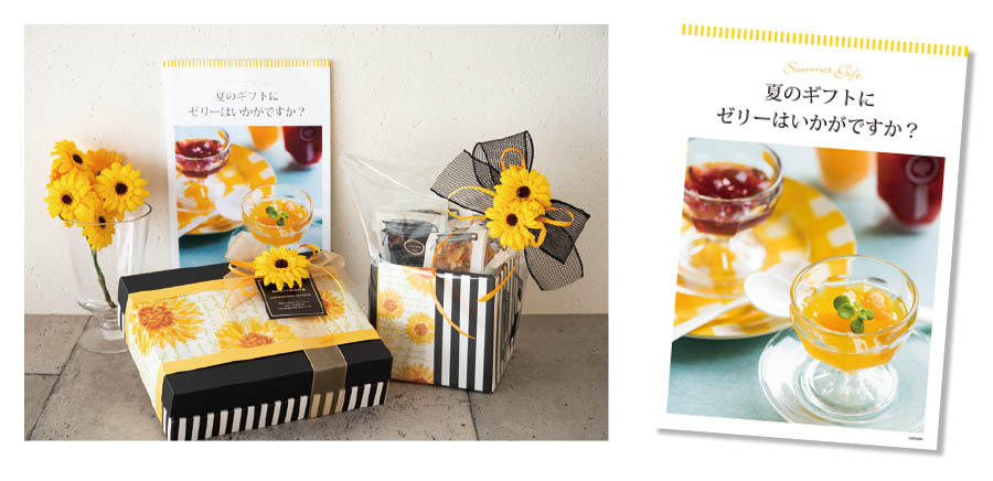 夏のご進物に喜ばれるゼリー 幅広い年代の方に喜ばれるゼリーは、 気軽なギフトにもお中元などの ご挨拶ギフトにもぴったり。 PET素材のハンドルボックスに、 好きな味を詰め合わせることができる ギフトもおすすめです。 お味を伝えるテイスティシールも たくさんご用意しています。 |