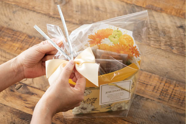 OPP袋に舟形ペーパーバッグを入れて、ワイヤーリボンを付けたら完成です。