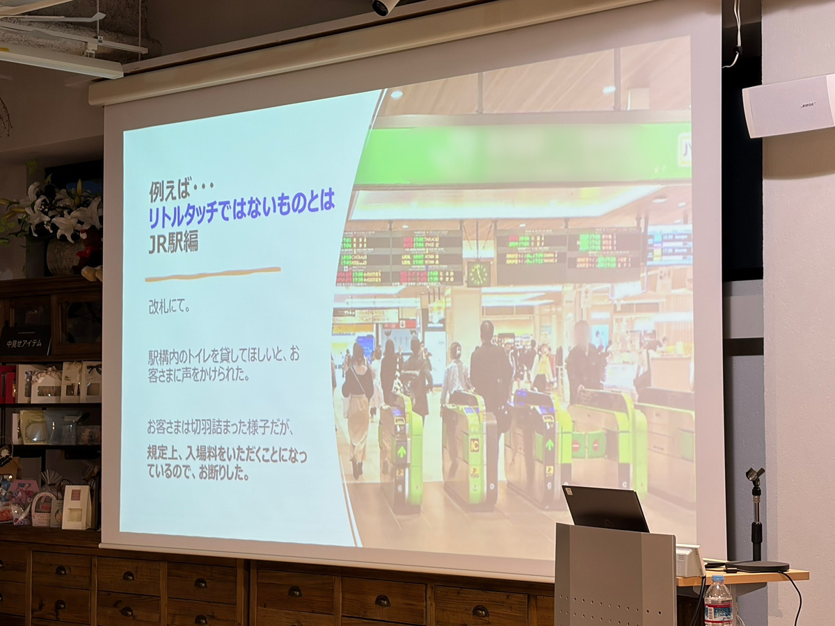 【駅の改札にて、「改札を出た後におなかが痛くなりトイレに行きたい」と切羽詰まった様子でお客様が声をかけてきたが、 ルール上、入場料をいただくことになるとお伝えしお断りをした。】